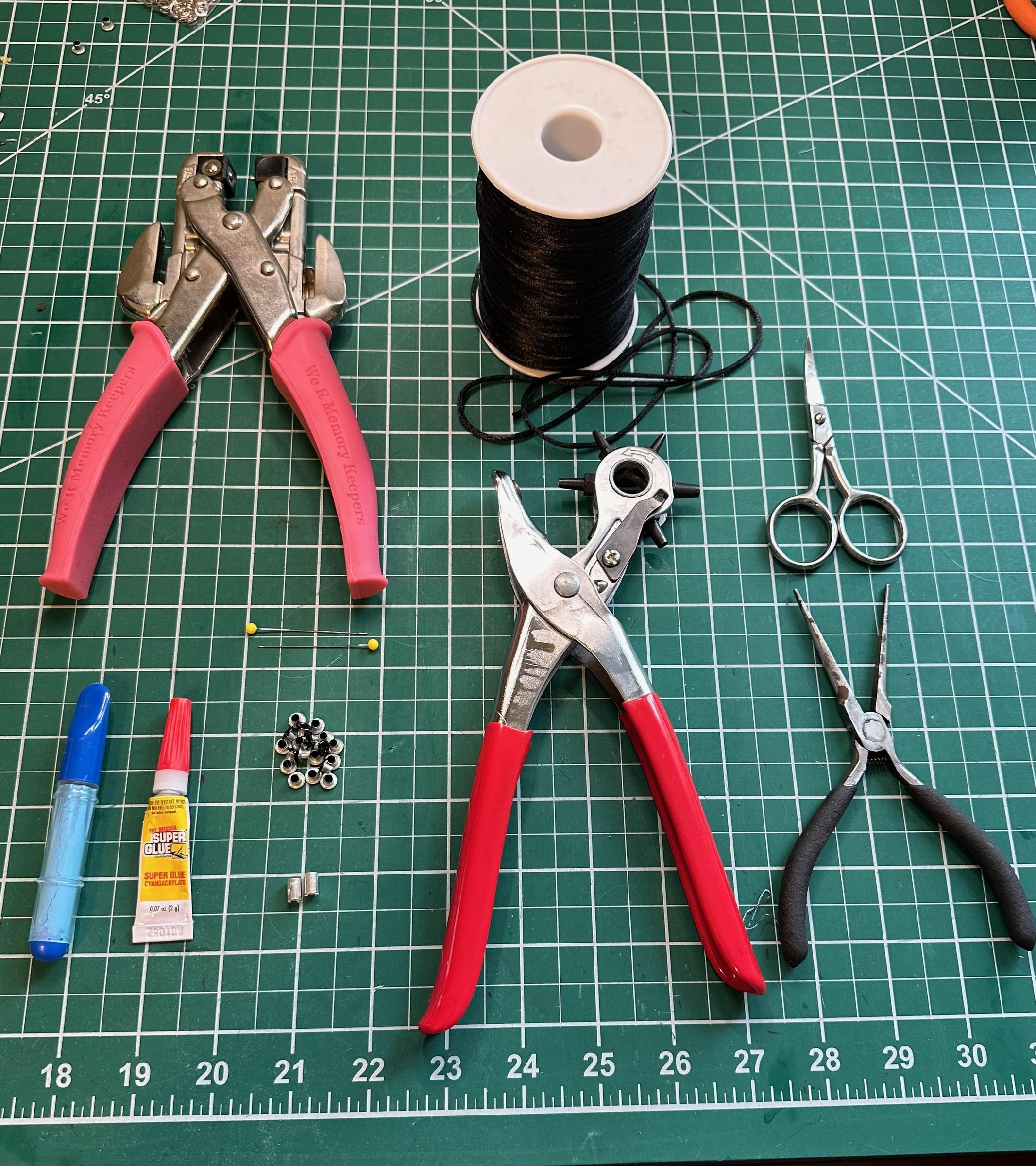 - Deri zımba - Benimkinin çeşitli boyutlarda zımbaları var. Hangi boyuta ihtiyacım olduğunu belirlemek için önce kağıt üzerinde deneyler yaptım. Bız iyi bir seçim değildir çünkü deliğin düzgün bir şekilde yerleşmesi için içinde boşluk olan bir deliğe ihtiyacınız vardır.